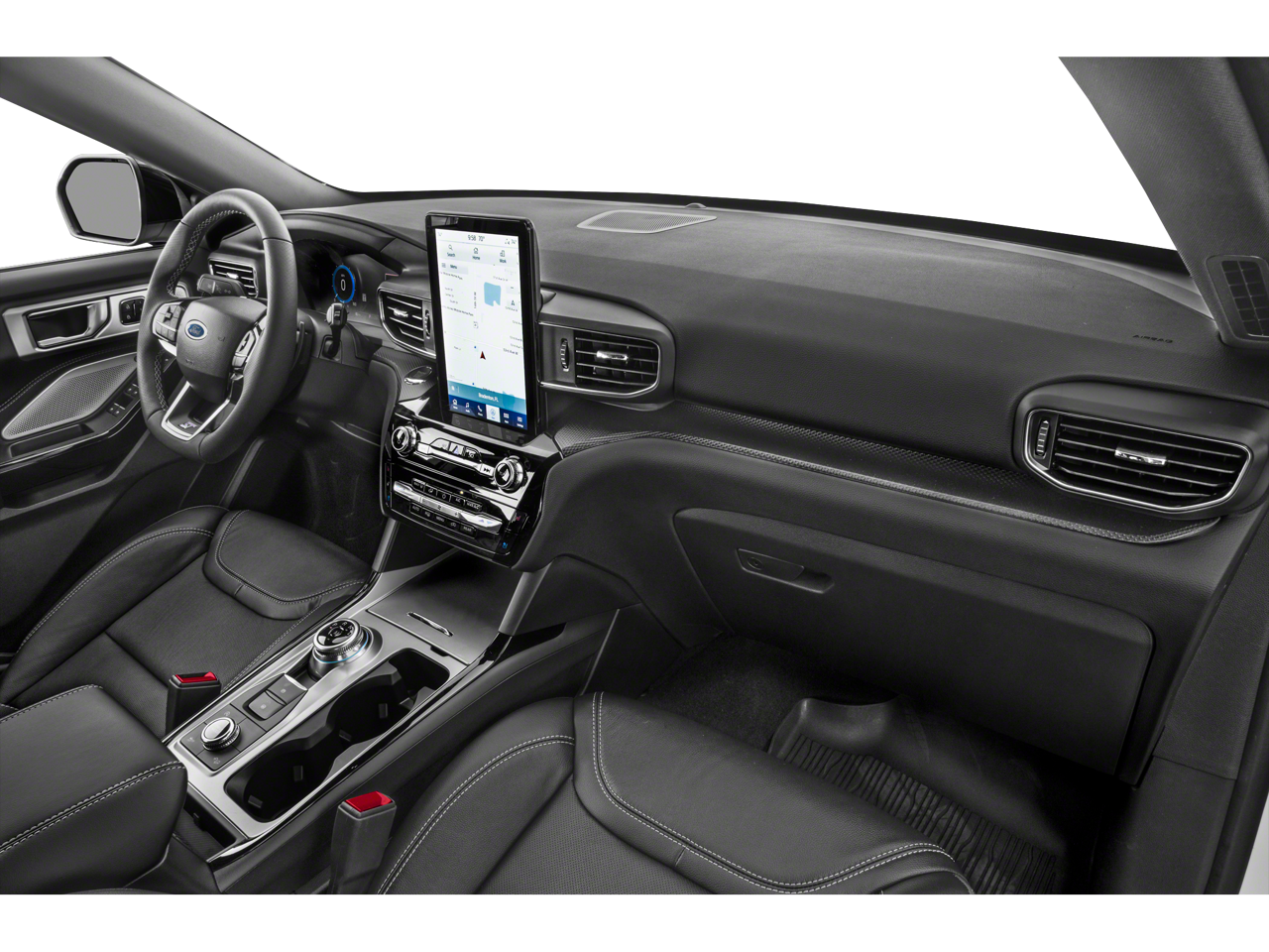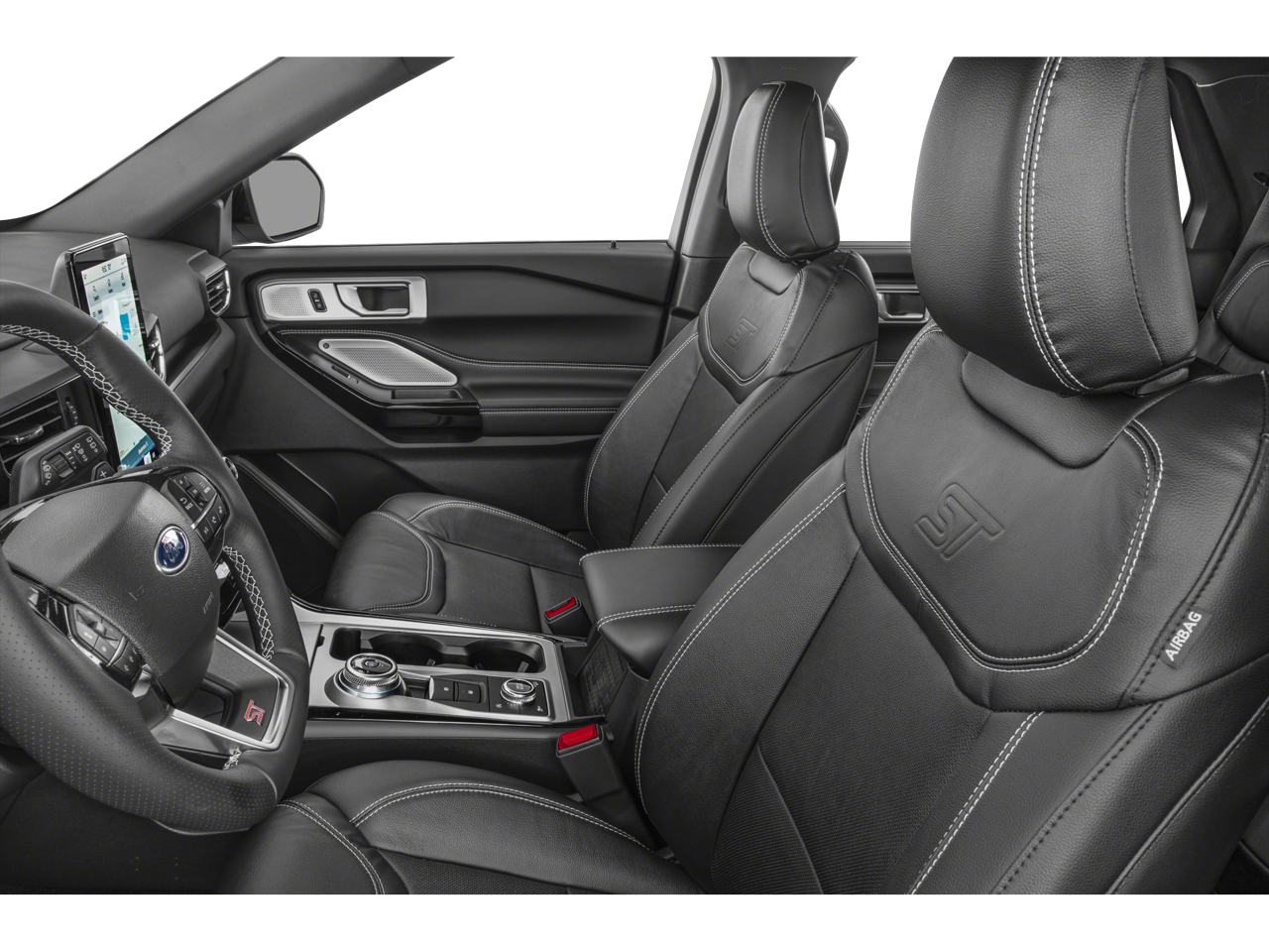 Step inside the Explorer ST and be enveloped in a world of sophisticated comfort. The leather-wrapped, heated, and ventilated sport seats offer exceptional support, while the 10.1-inch touchscreen display with the advanced SYNC 3 infotainment system puts a wealth of connectivity and entertainment at your fingertips. Enjoy the convenience of wireless charging, the clarity of the 12-speaker B&O sound system, and the expansive views afforded by the twin-panel moonroof.